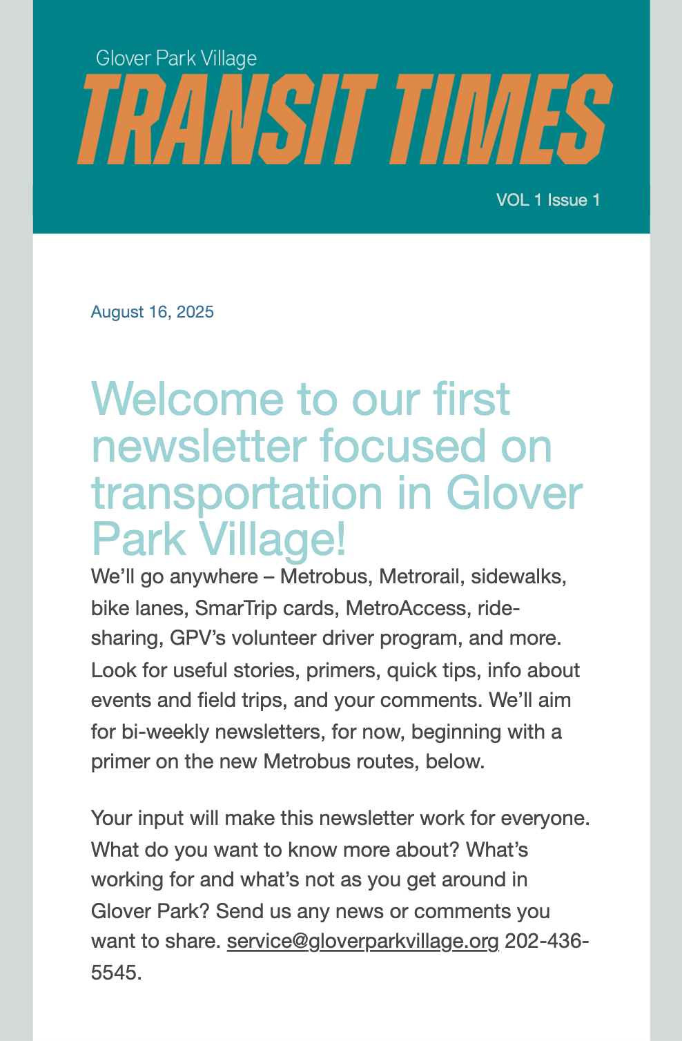 Transit Times NewsletterOur bi-monthly newsletter informing our community of all things related to public transportation in Glover Park. Vol. 1 Issue 1 See full newsletter